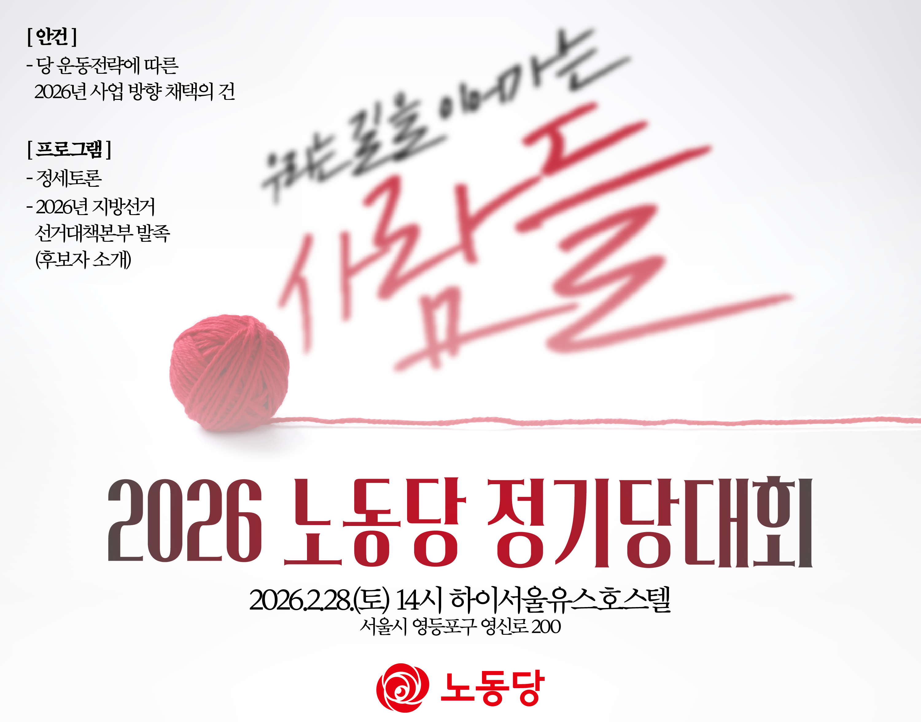 홈페이지브리핑&일정 +더보기 썸네일 제목 작성일 한국GM 세종부품물류지회 원정투쟁 2026.01.23 성명&논평 +더보기 썸네일 제목 작성일 청년위원회 성명] 경찰은 세종호텔 사측의 사병인가? 2026.02.03 노동당 Youtube이슈 페이퍼 +더보기 썸네일 제목 작성일 REd View: 노동 9호 (노동운동동향보고) 2026.01.26 공지 +더보기 제목 작성일 N 2026년 5차 상집 및 3차 확집 회의결과 2026년 5차 상집 및 3차 확집 회의결과 일시 : 2026.02.2.(화) 14:30 장소 : 중앙당사 참석 : 이백윤, 김성봉, 정상천, 장혜경, 유용현, 이종희 보고1] 상집 주간업무 및 주요 일정 보고 - 보고를 접수함 - 기후정의동맹 회의 참석과 관련하여 선전홍보국장에게 상황을 확인한 후 담당자를 정하기로 함 - 탈핵비상시국회의에 대표단에서 1인이 참석하기로 함 보고2] 사무총국 주간업무 보고 - 보고를 접수함 보고3] 전차 회의결과 보고 - 문서로 대체함 보고4] 위원회 및 사업단 활동 보고 - 문서를 토대로 보고를 진행함 - 상집에서 ‘기후정의 교안’이 검토되지 않고 있음을 확인함 - 당원 기본교육 이수 현황과 교육 후 작성한 설문 내용을 모두 파악하여, 교육기획위원회에 공유하기로 함 - 정책위원회 보고와 관련하여 : 레드뷰 시선 5호 코너 중, ‘지방선거 대응 방향 요약’ 파트를 이백윤 대표가 작성하기로 함 : 사회적 쟁점으로 부각하고 있는 ‘생성형 AI’에 대한 다양한 입장이 제출되는 토론회를 준비하기로 함 보고5] 기타 활동 보고 - 보고 없음 안건1] 한국GM부품물류지회 투쟁 승리를 위한 노동당 투쟁계획의 논의의 건 - 문서를 토대로 논의를 진행함 - 사업계획으로 제출된 : 1)과 2)는 원안대로 각 당부에 요청하여 진행하기로 함 : 3)은 당원들의 참여를 독려하기로 함 : 4)는 노조의 일정을 확인한 후 결합하기로 함 안건2] 헌재 위헌 결정에 따른 선거제도 전면 개혁 촉구 공동 기자회견 기획(초)안 검토의 건 - 문서를 토대로 논의를 진행함 - 원안대로 진행하되, 아래의 내용을 요구사항과 슬로건에 추가할 것을 제안하기로 함 : 완전비례대표제로 전환, 자유로운 선거연합정당 허용 안건3] 당부별 공직선거후보자 자격심사위원 임명의 건 - 문서를 토대로 논의를 진행함 - 원안대로 임명하기로 함 안건4] 기타 안건 논의 - 체제전환포럼준비팀의 요청에 따라, 자원활동가를 조직하기로 함 - 사회대전환연대회의 정책플랫폼 초기 논의에 당직자를 파견하기로 함 - 성폭력 피해자의 회복을 지원하기 위해 피해자를 조력하고 있는 당원과 소통하기로 함. 또한, 성폭력 대응에 필요한 인식 형성을 위한 추가 방안을 모색하기로 함 차기 회의는 2/9(월), 14시에 중앙당사에서 진행하기로 함 회의자료 http://www.laborparty.kr/?page_id=13932&mod=document&pageid=1&uid=3742&execute_uid=3742 2026.02.03 N 2026년 2차 (임시) 전국위원회 회의결과 2026년 2차 (임시) 전국위원회 회의결과 0. 개최 일시 및 장소 - 일시 : 2026년 01월 31일(토) 14:00 - 장소 : 온라인 - 의장단 : 김강호, 윤정현 - 서기 : 정상천 - 검표 : 유용현 *성원 확인 -> 개회 -> 보고 -> 안건 순으로 진행 1. 성원 보고 총원 : 41명 사고 : 0명 재적 : 41명 의사정족수 : 21명 재석 : 22명 (14:05) 개회 선언 14:05 2. 회순 결정 - 보고 진행 - 안건 처리 안건1] 2026년 정기당대회 소집의 건 3. 보고 진행 보고1] 중앙당 회계처리 내역 검사 결과 보고서 발제 : 정상천 사무총장 - 질문 없음 보고를 접수함 보고2] 전차 회의결과 발제 : 정상천 사무총장 보고를 접수함 - 당헌당규에 따라 정기당대회는 1개월 이전에 소집되어야 하지만, 정기당대회 소집 안건인 ‘2026년 사업방향의 건’의 내용 보강이 필요하다는 2026년 1차 전국위원회의 결정에 따라 1주일 늦게 공지하는 것을 전국위원회 결정으로 처리하기로 함 4. 안건 처리 결과 안건1] 2026년 정기당대회 소집의 건 발제 : 이백윤 대표 1) 18p, 2) 공공교통운동 방안 중 ‘네 번째 ■를 삭제’ 요청을 반영하여 원안을 수정하기로 함 2) 19p, ‘공공돌봄 운동 방안 1. 기본 원칙 : 단계적·결합 중심 접근’ 설명 문안 중 기본 원칙으로 한다. 뒤에 ‘2026년 3월 시행되는 통합돌봄지원법에 대한 대응을 포함해’라는 문장을 추가하자는 제안이 있었음. 이를 반영하여 원안을 수정하기로 함 3) 강동진 전국위원 수정동의안 발의 20p, 2) 당 가동역량 구축 중 세 번째 항목 ‘의제조직 활성화를 위해’~ 이하 부분을 삭제하고, ‘일상적 논의구조를 만든다’를 추가하자는 안 제청 삼청으로 수정동의안 성립 재적 25명 중 8명 찬성으로 부결 4) 원안 표결 만장일치로 가결 5. 폐회 16시 02분 회의자료 및 출석/표결표 http://www.laborparty.kr/?page_id=13932&mod=document&pageid=1&uid=3740 2026.02.03 2026년 정기당대회 소집 공고 2026년 정기당대회 소집 공고 당규 제2호 제5조(소집) 1항에 의거하여 ‘2026년 정기 당대회’를 아래와 같이 소집합니다 - 아 래 - 일시 : 2026. 2. 28. (토) 14:00 장소 : 하이서울유스호스텔 (서울시 영등포구 영신로 200) [안건] 1. 2026년 사업방향 채택의 건 2026. 2. 2. 노동당 당대회 의장 나도원 ※ 당일에 정세토론 및 2026년 지방선거대책본부 발대식이 있을 예정입니다. 회의자료 http://www.laborparty.kr/?page_id=13932&mod=document&pageid=1&uid=3735&execute_uid=3735 2026.02